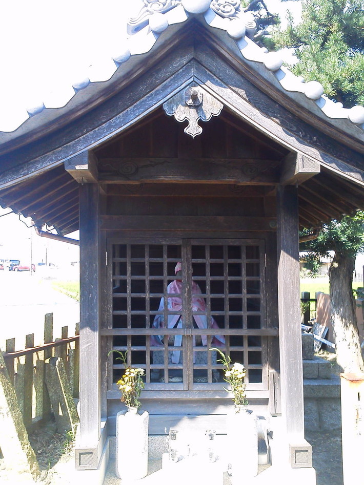 津島の昔からある集落に残る地蔵堂(お地蔵さんではないものもあるかもしれません)シリーズの金柳です。べべ着て頭巾をかぶって、花を供えられて…大切にされてきているようです。