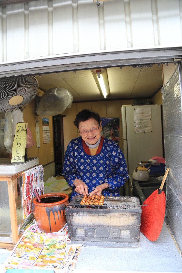 赤のれん開店当初からみたらしを焼いて58年。写真コンテストに出すからと言ったら、すてきな笑顔を撮らせてもらいました。