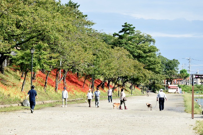 天王川公園の彼岸花が今見頃を迎えています。今日は(9月26日)散歩する皆さんも、暫し足を止めては真っ赤な花にうっとりの様子でした。