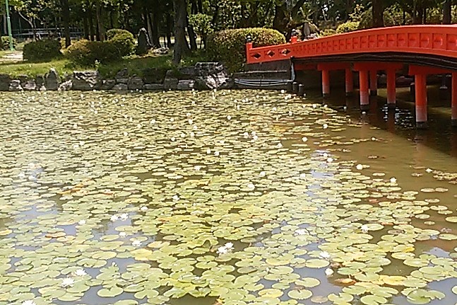 梅雨の晴れ間、天王川公園を散歩中に初夏の花「睡蓮」が白い花を咲かせて水面に浮かんでいました。その下を鯉が数十匹泳いでおり、見る人の心を和ませています。