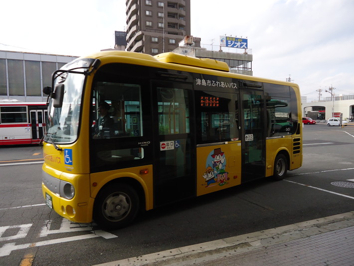 市の巡回バス「ふれあいバス」です。1回100円で乗ることができます。