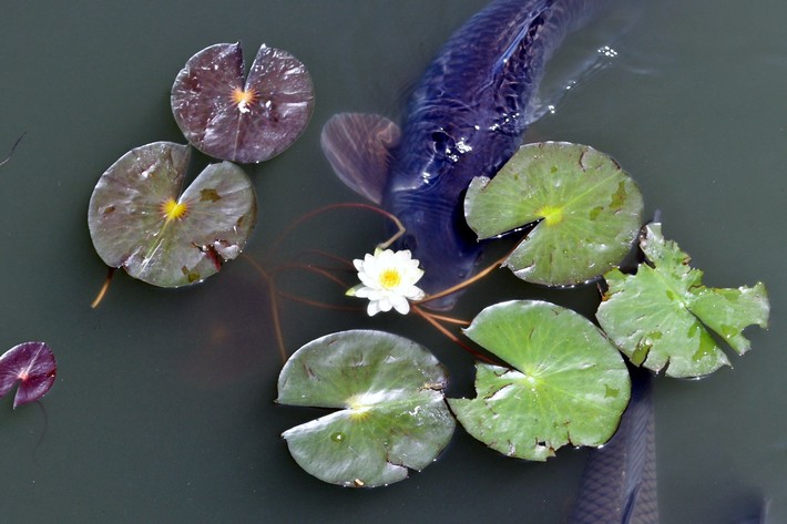 5月、天王川公園の丸池一面に睡蓮の白い花が咲きます。池には亀や鯉もいっしょに生息しています。写真は睡蓮の花とたわむれる真鯉です。