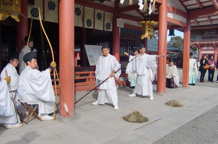津島神社の祭礼、旧暦1月16日に執り行われる。6人の射手が蕃塀(ばんぺい)に掲げた大的めがけ各々3回矢を射ます。