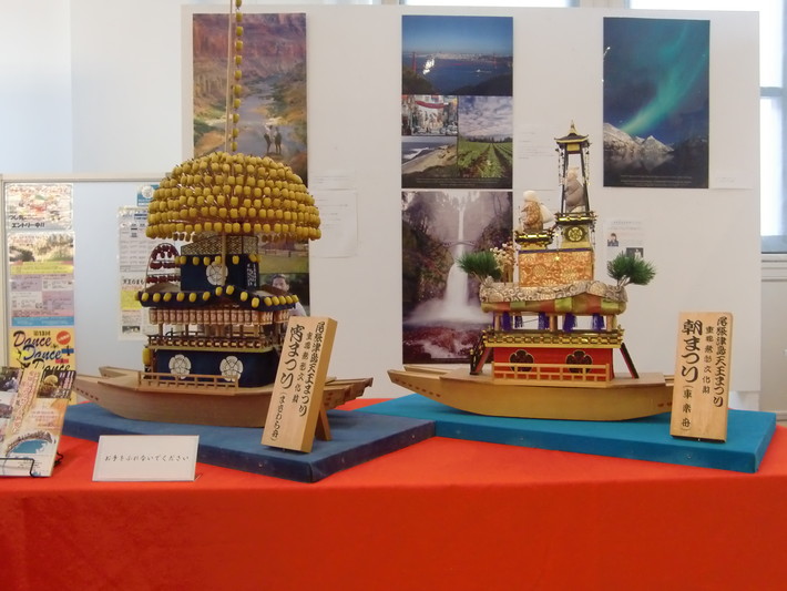 観光交流センターでアメリカWEEK開催中です。パネル展でアメリカが民族のるつぼと言う意味がよく分かりました。館内には天王祭のレプリカが飾ってありました。